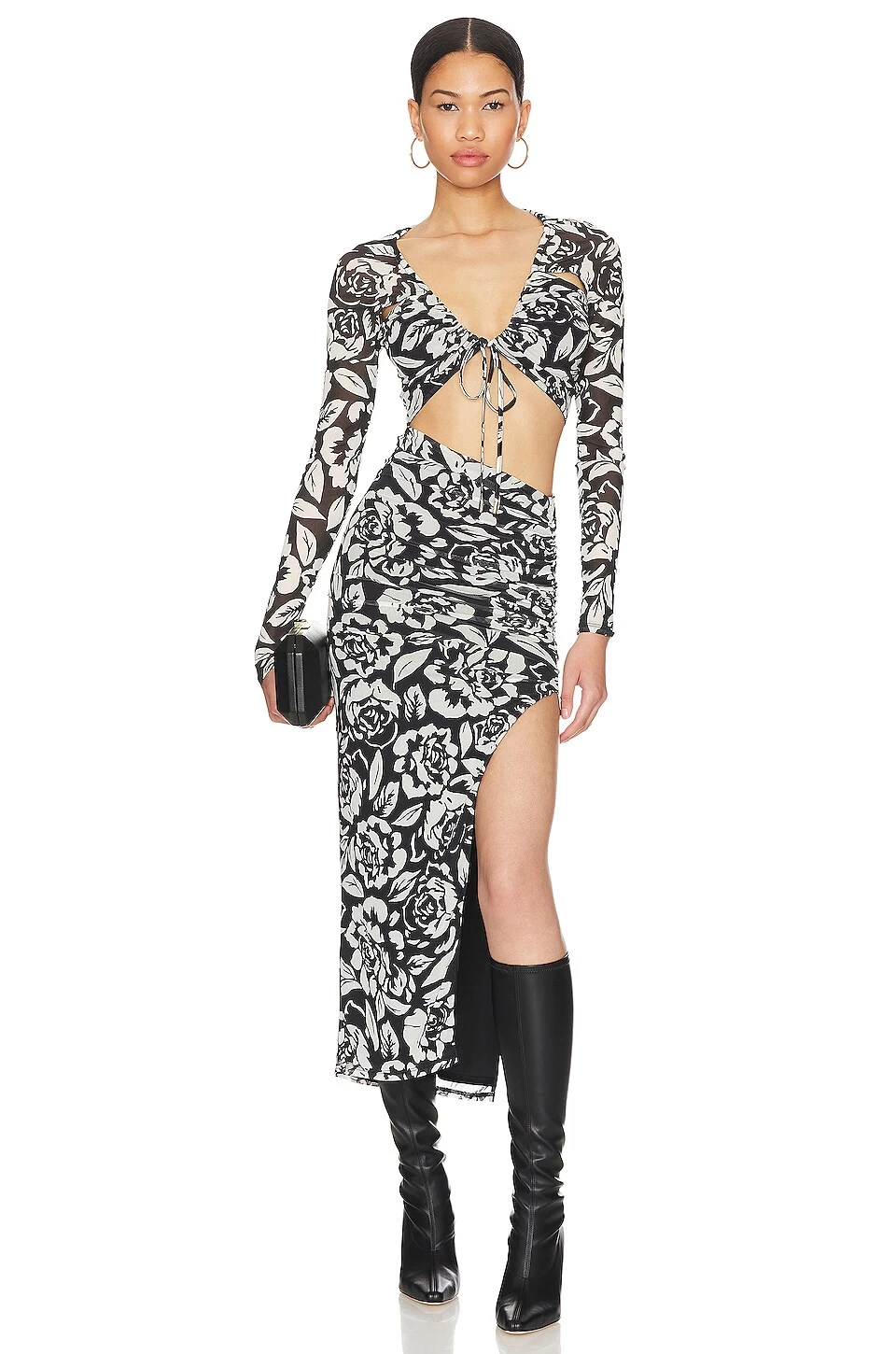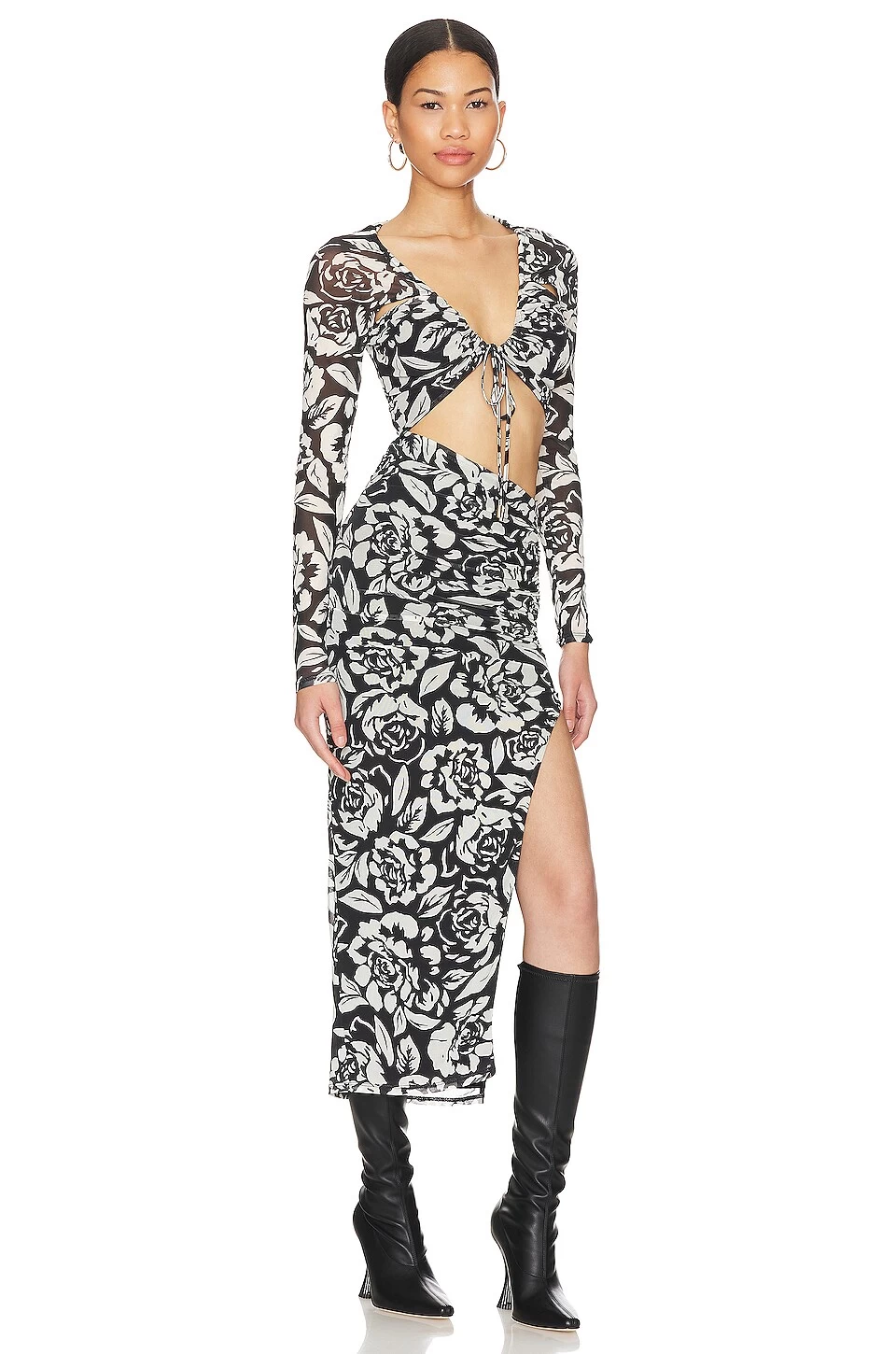 - Sheer mesh fabric overlay with ruched detail at side seam slit