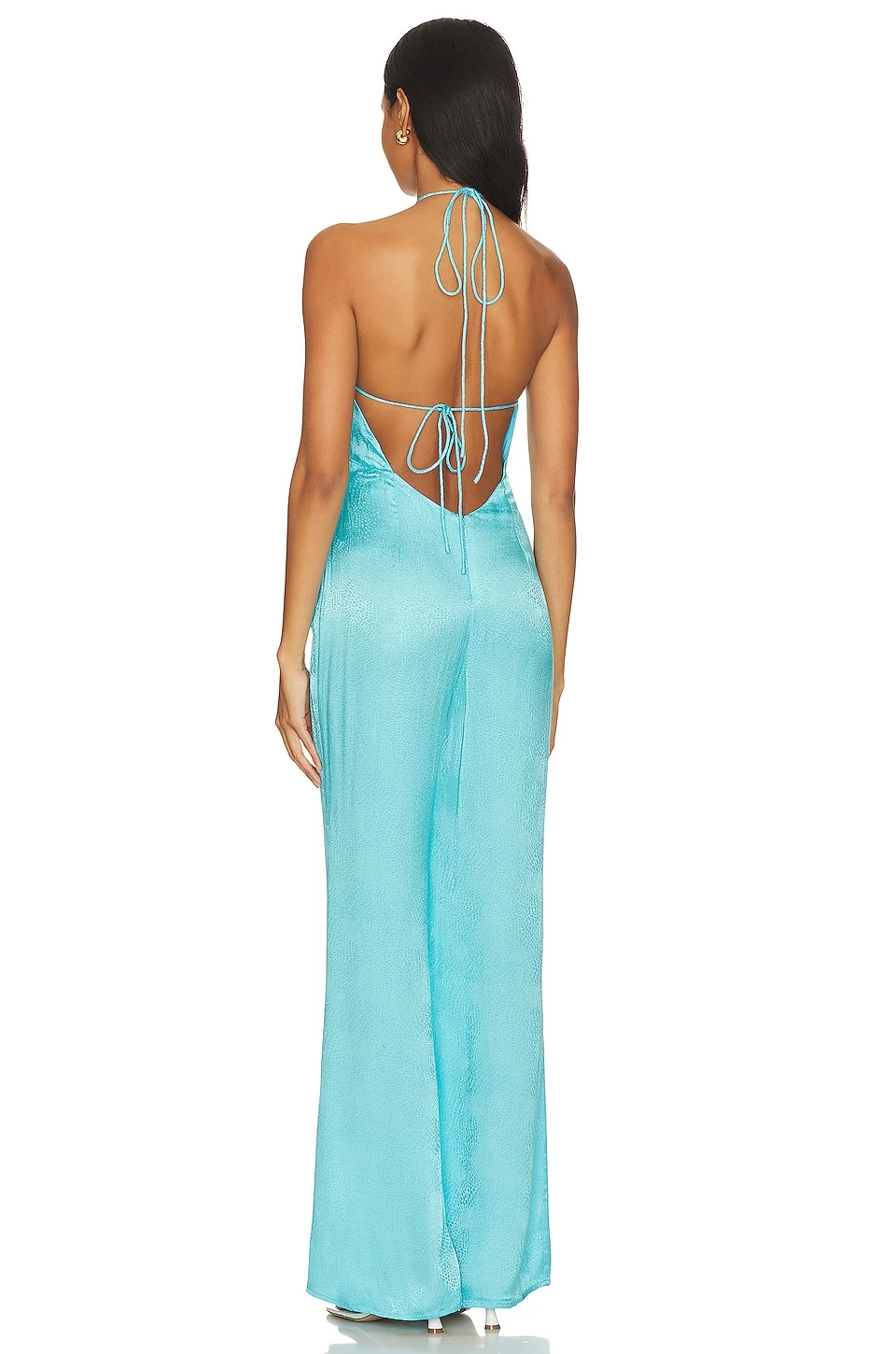 - Halterneck and back tie closure
