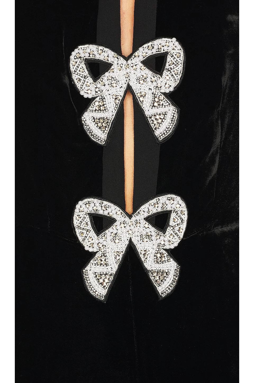 - Faux pearl and rhinestone embellished bow accents at center bodice