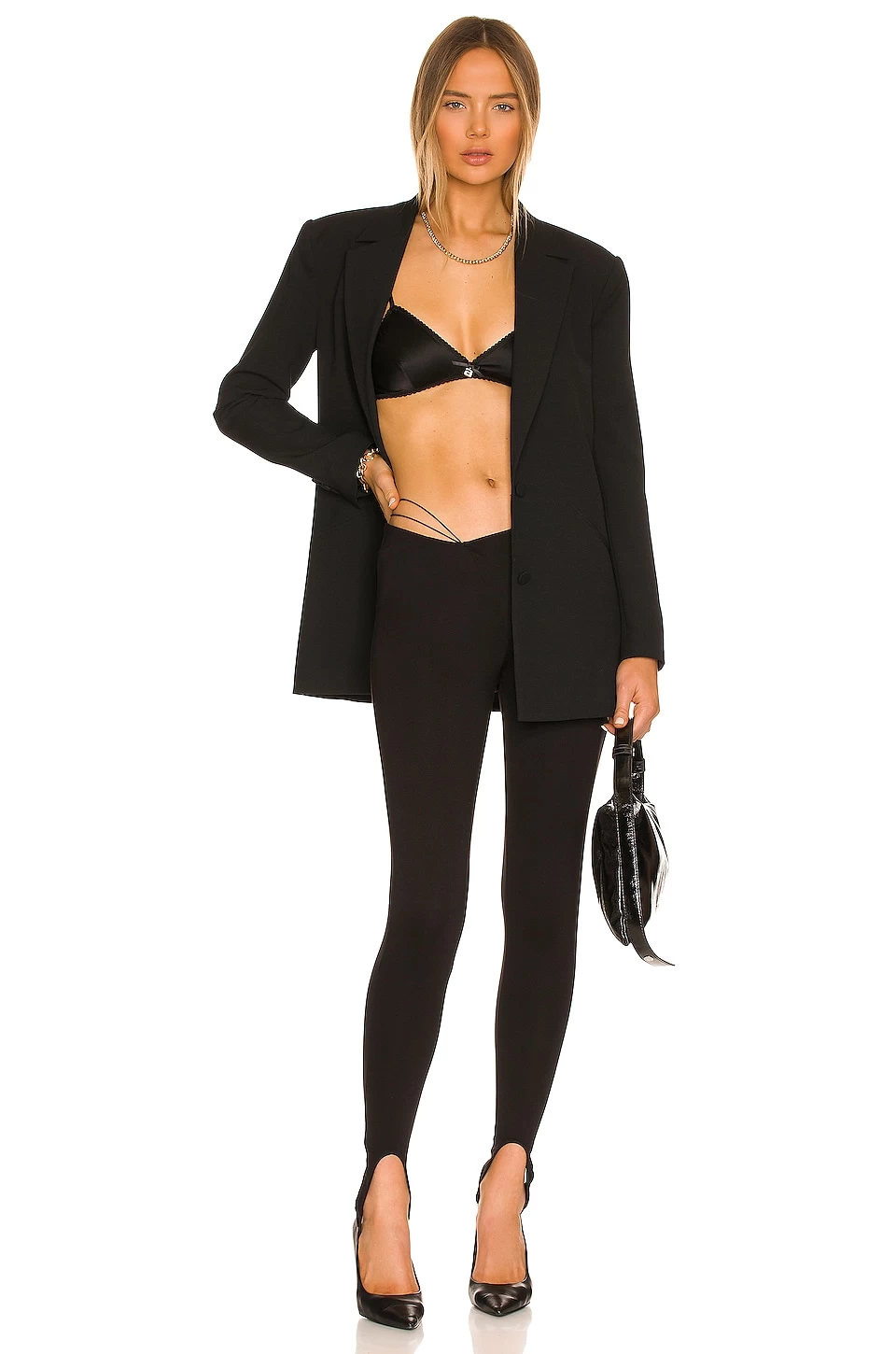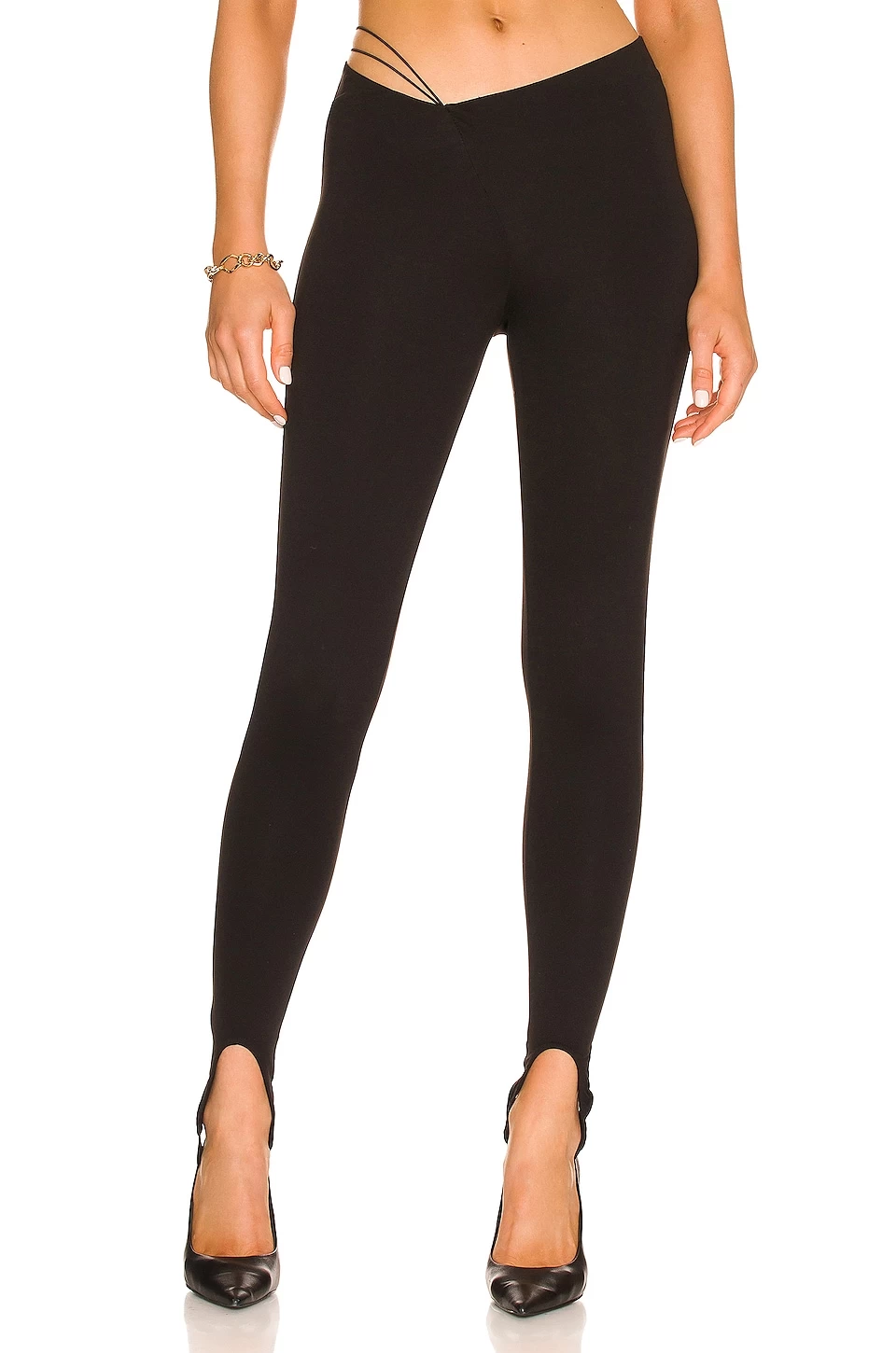 - Asymmetric waistline with strappy hip accents