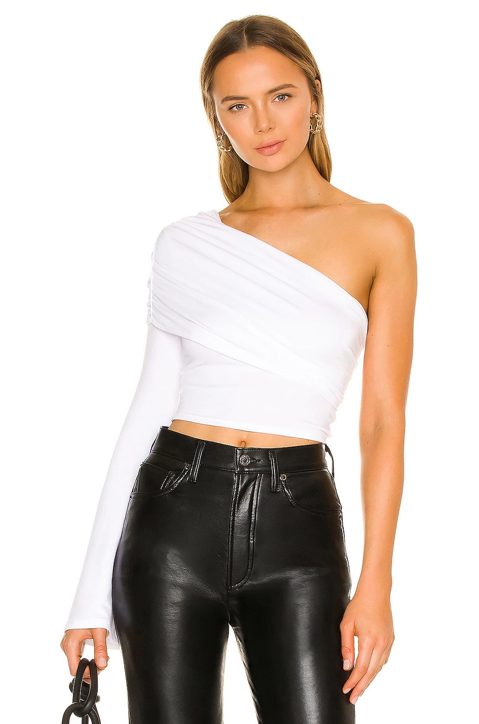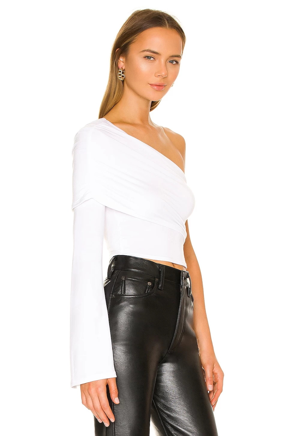 - One shoulder styling with ruched foldover neckline